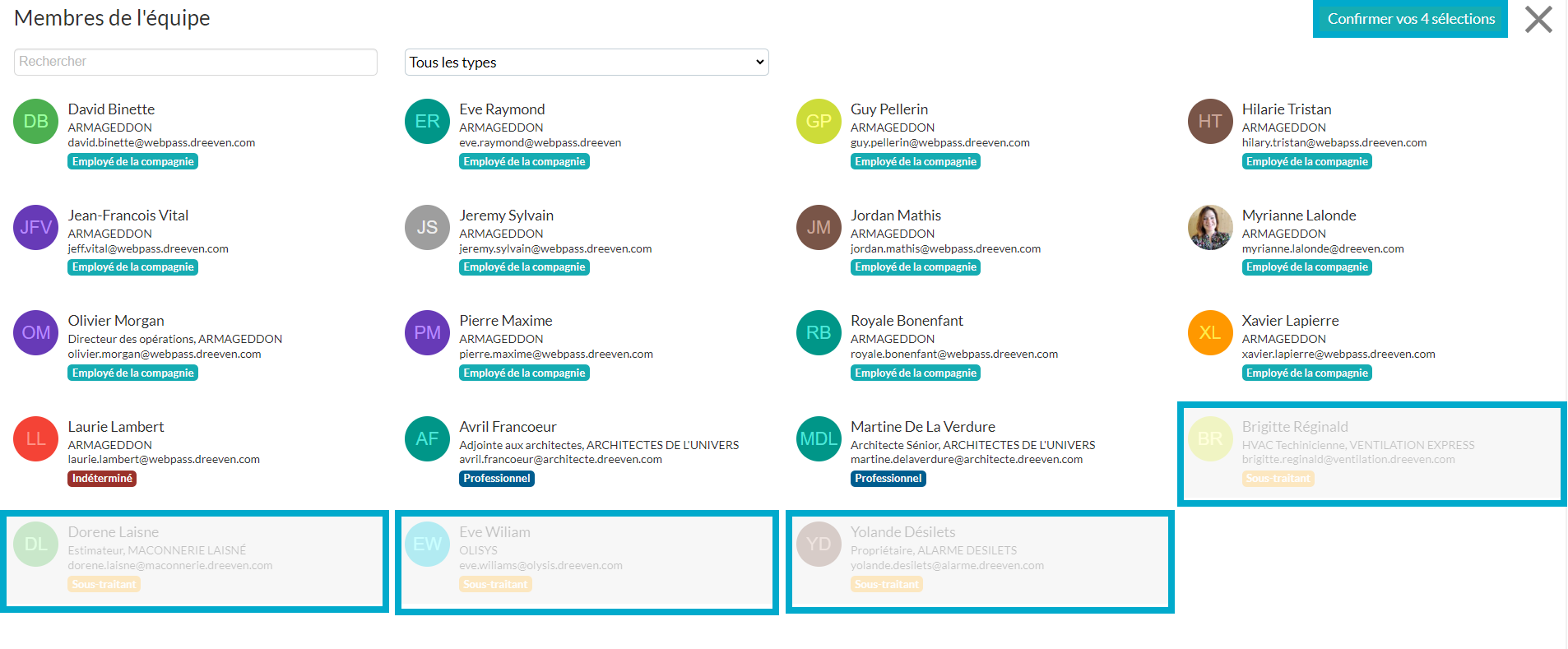 4. Écrivez une adresse courriel à la main, ou cliquez sur une des trois icônes vous permettant de chercher parmi les sous-traitants, les membres de l'équipe ou le carnet d'adresses.