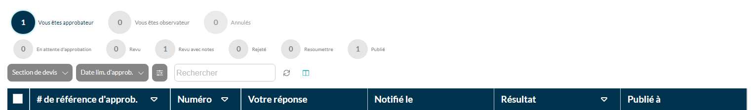 Dans ce tableau les bulles représentent si vous avez été assigné comme approbateur, comme observateur ou si demande a été annulée.