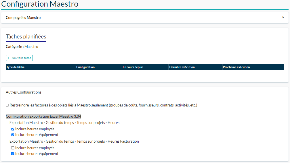 8. Toujours depuis Configuration Maestro, rendez-vous à la carte Configuration Exportation Excel Maestro 3.04 pour cocher les options souhaitées.